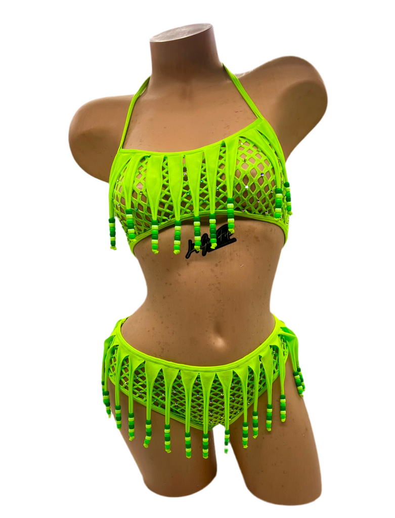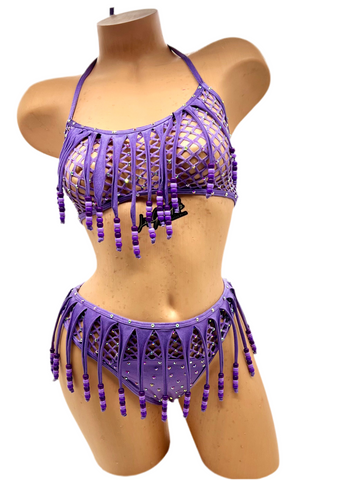 Unleash your wild side in the Shay Shay cabaret set. The halter top and thong shorts are made from a sexy cabaret net and stretchy spandex, trimmed with fringes, beads, and AB Swarovski crystals. Dare to stand out and shine with this bold and alluring ensemble.