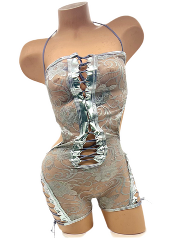 Take a bold step and elevate your style with Riyah. This one-piece combines lycra stretch spandex strings for a daring look that laces up the center and on each leg, while the low cut back allows for a confident display of your best assets. With lace and metallic trim, stand out in this daring and adventurous outfit.